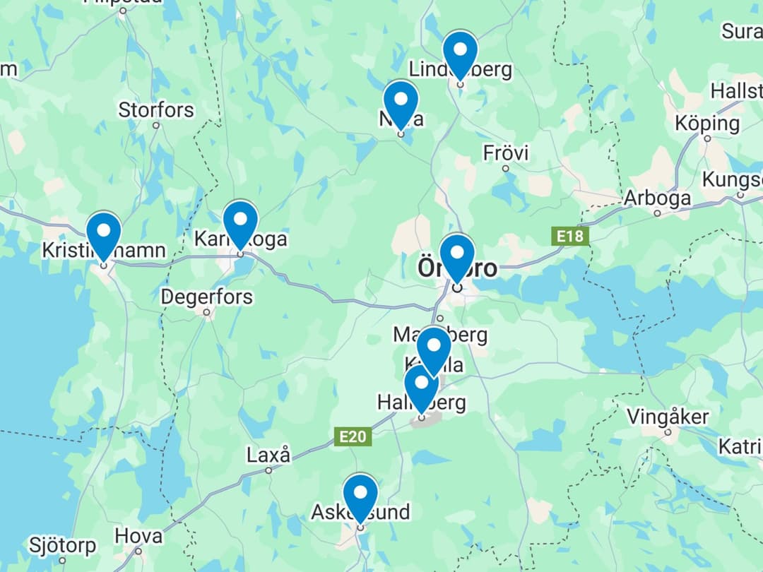 Örebro, Lindesberg, Nora, Karlskoga, Kristinehamn, Kumla, Hallsberg och Askersund